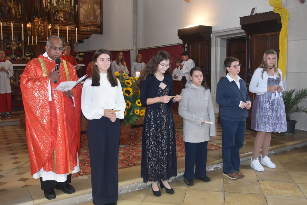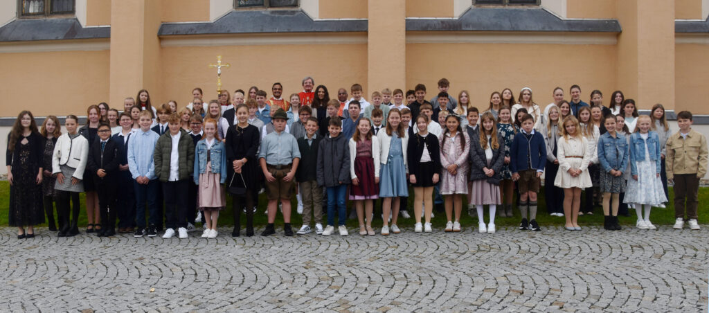 „An Jesus kann ich mich festmachen“, versprach Domkapitular Msgr. Walter Schmiedel in seiner Predigt und hatte dabei das Bild eines Ankers mit dabei. 73 Jugendliche aus der gesamten Pfarreiengemeinschaft waren mit ihren Patern und Familien in die Aindlinger Pfarrkirche gekommen, um das Sakrament der Firmung zu erhalten. Zusammen mit Pfarrer Babu und Pater Sunoj feierte der Domkapitular den Gottesdienst. Musikalisch umrahmt wurde die Messfeier vom Venite!-Chor mit Liedern wie „Du führst uns hinaus ins Weite“ und „Wie das ist, wenn da jemand ist“. Im Anschluss versammelten sich die Firmlinge zum Gruppenfoto vor der Pfarrkirche.