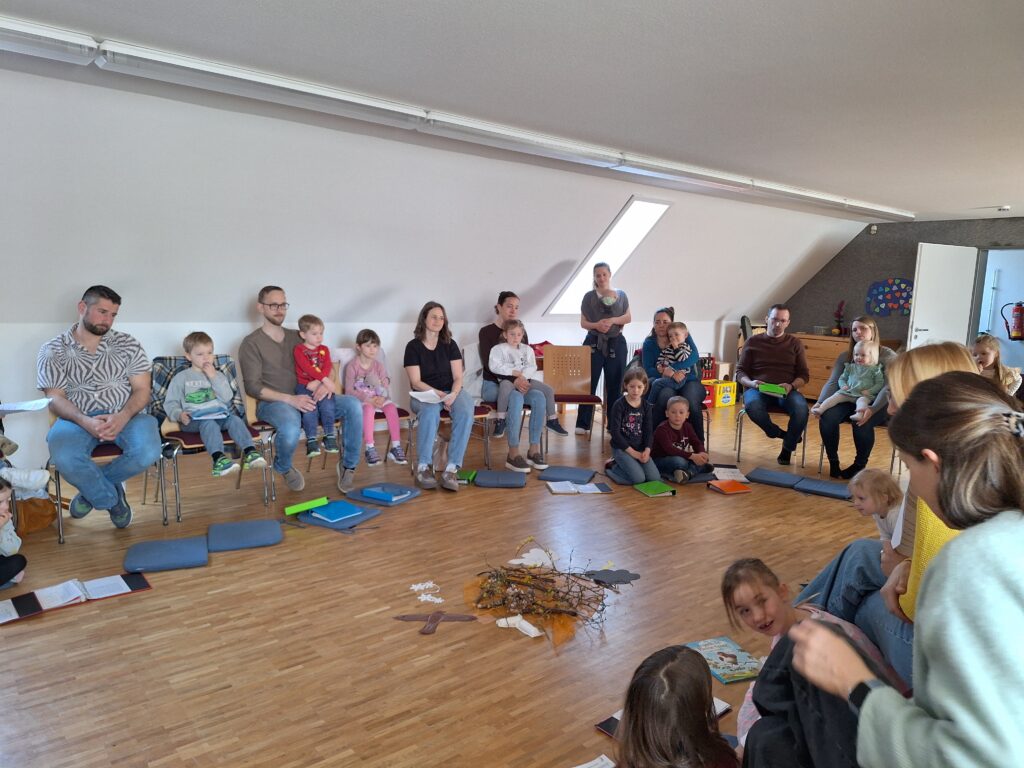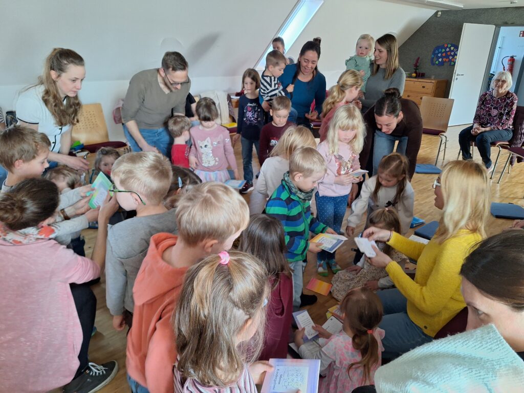 Zum Kindergottesdienst waren die Kleinsten der Pfarrei mit ihren Eltern oder Großeltern ins Aindlinger Pfarrheim gekommen. Rund 30 Buben und Mädchen hörten dabei die Geschichte des Spatzen Max, der zu ängstlich war, sein Nest zu verlassen und zu fliegen. Auf die Frage, wovor die Kinder Angst hätten, antworteten die Kleinen: „Vor Gewitter, vor Spinnen, vor Schlangen…“. Und immer, wenn man Angst habe, dann kommt man gerne zum Kuscheln zu Mama oder Papa. Und so kann man auch zu Gott kommen, um sich geborgen zu fühlen. Mit Liedern, Fürbitten und dem Vater-unser-Gebet wurde der Kindergottesdienst abgerundet. Zum Schluss bekamen die Buben und Mädchen noch ein Sammelbuch, in das sie von jedem Kindergottesdienst ein Gebet einkleben dürfen.