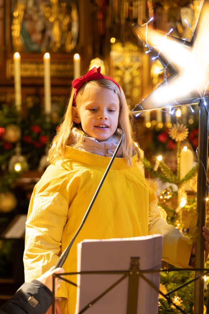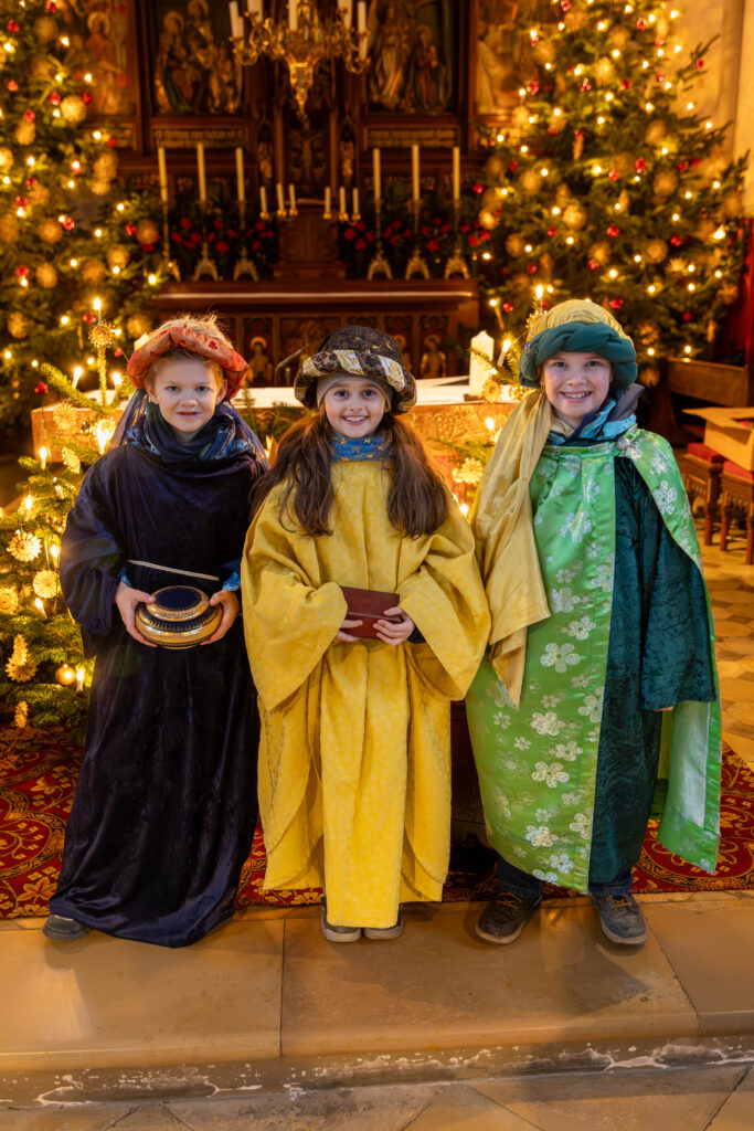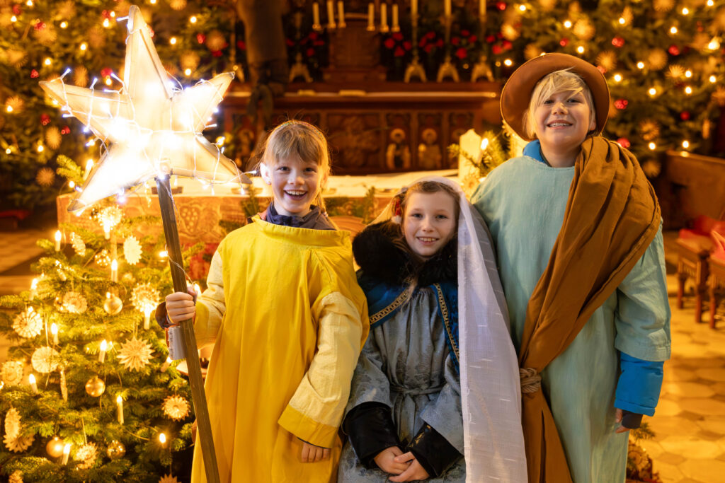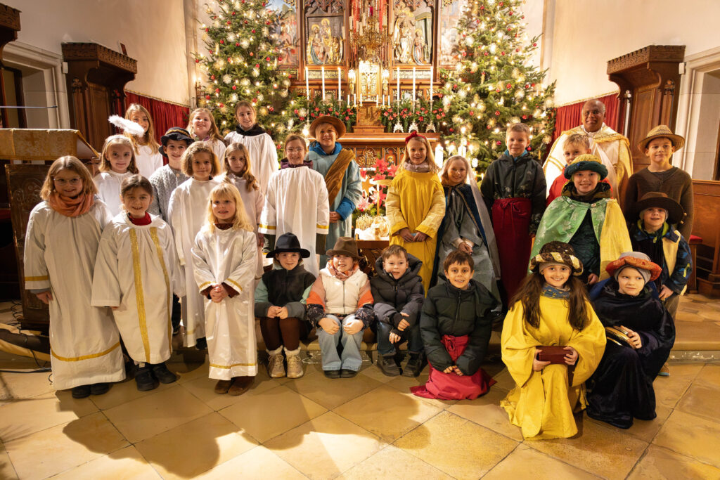 Die Erstkommunionkinder des kommenden Jahres hatten das Krippenspiel fleißig einstudiert und geprobt und waren voller Vorfreude dabei – Hirten und Schafe – bitte entschuldigt: dieses Jahr wird jemand Strahlendes euch den großen Auftritt stehlen“. So begann das Krippenspiel, in dem der Weihnachtsstern die wichtige Erzählerrolle übernahm.